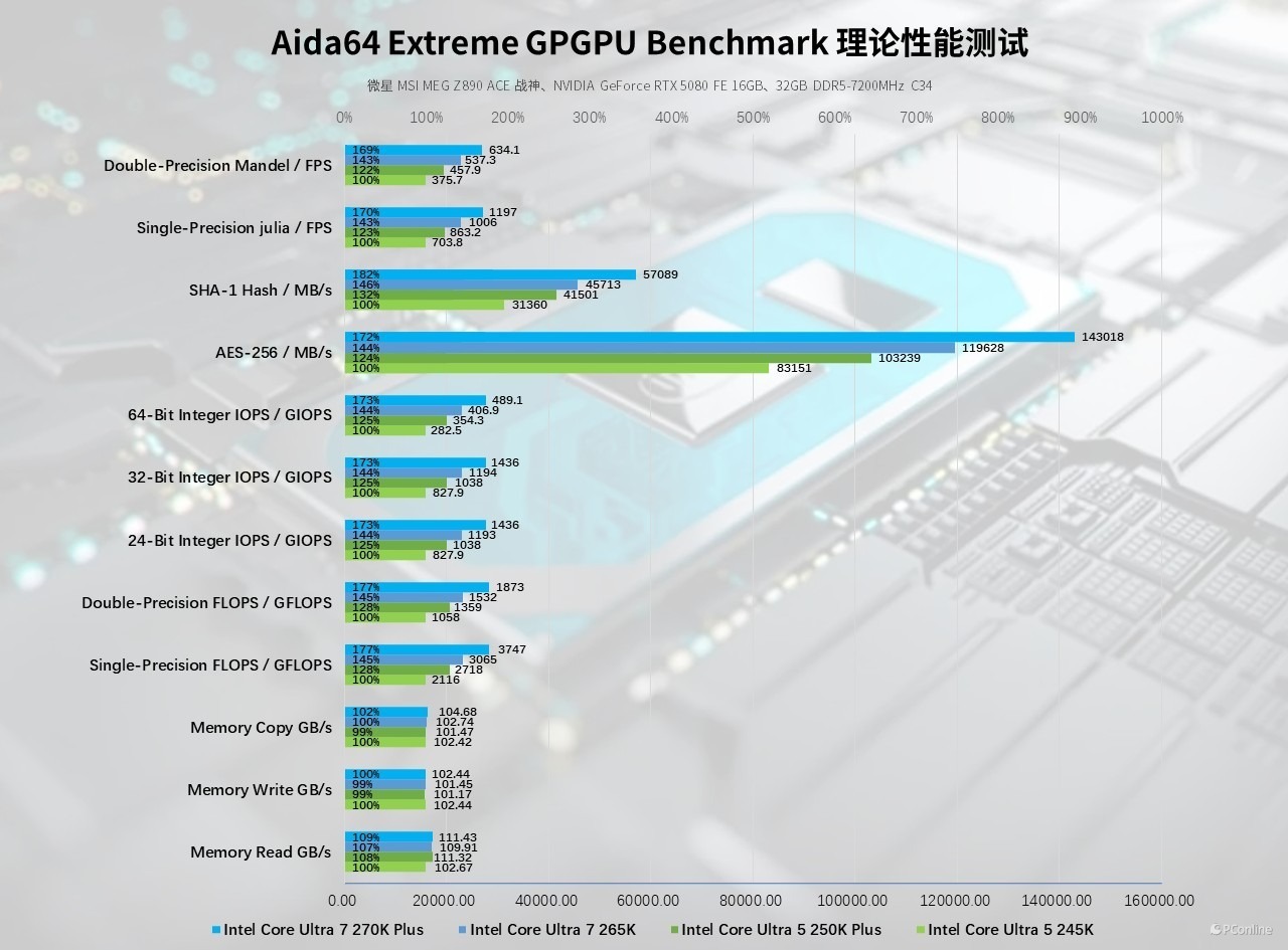 除此之外,两款新品在全场景通用计算项目中均实现了无短板的全面领先。在 AES-256 加密运算测试中,酷睿 Ultra 7 270K Plus 吞吐量达到 143018 MB/s,相较前代提升约 30%,即便是酷睿 Ultra 5 250K Plus 也实现了 24% 的性能提升,大幅优化了文件加密、视频编码解码等场景的处理效率;单双精度浮点运算峰值(FLOPS)方面,酷睿 Ultra 7 270K Plus也很给力,相较前作实现了32%的性能跃升,酷睿 Ultra 5 250K Plus 也有 28% 的领先,通用计算底子拉满!