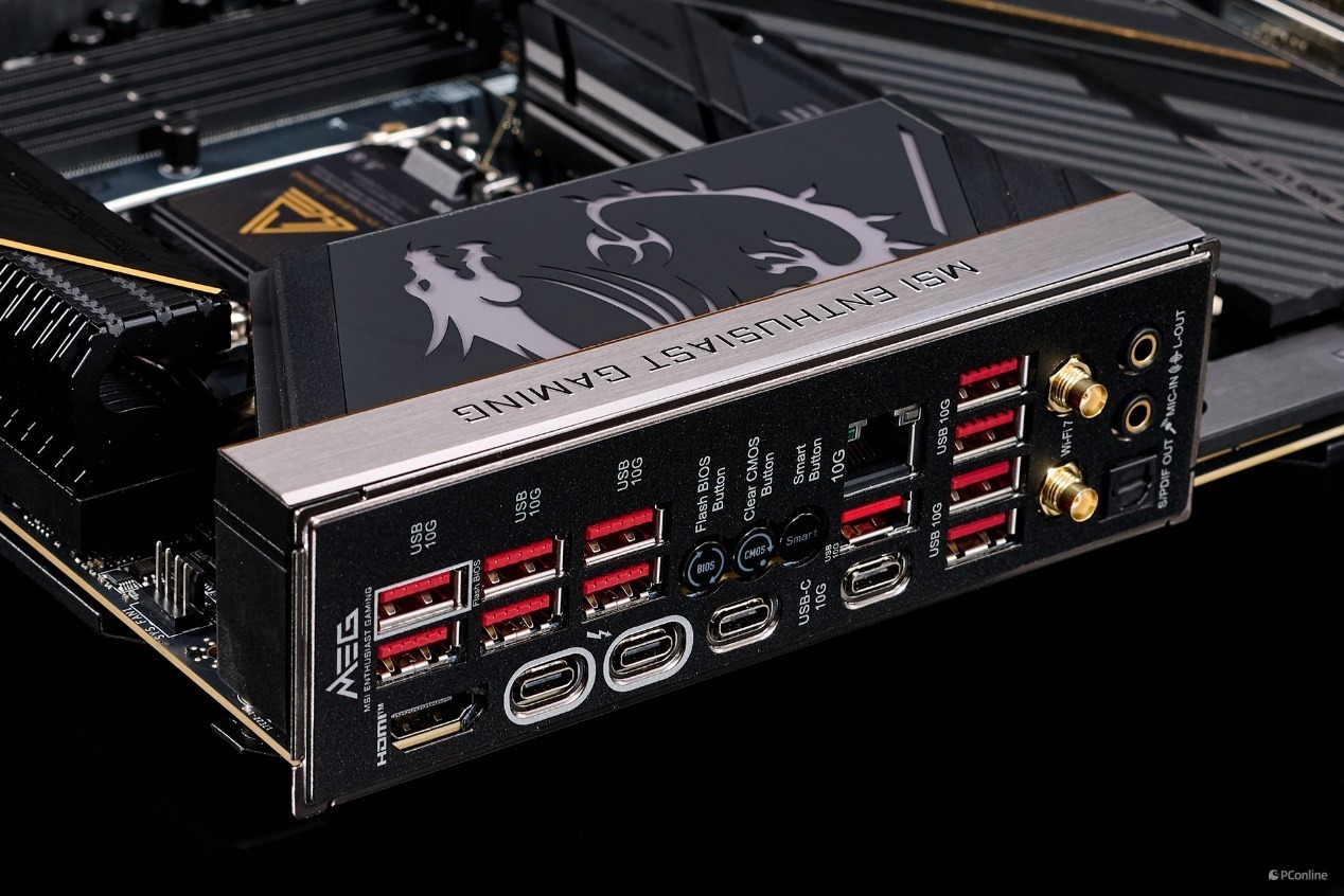 至于接口方面,后置I/O部分提供了1个HDMI 2.1接口、2个雷电4接口(40Gbps,支持视频输出)、2个USB 10Gbps Type-C、10个USB 10Gbps Type-A、1个10G网线接口、WiFi 7天线接口、3.5mm音频口、光纤数字音频接口、重置CMOS按键以及BIOS更新按键和智能按键。