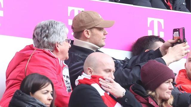 安联球场看台上同样精彩纷呈。拜仁队长曼努埃尔-诺伊尔与身旁一位年长女球迷自拍,他主动拿过对方手机完成合影,这位2014年世界杯冠军门将本场比赛因伤缺席。尽管在左小腿肌肉再次撕裂两周后已恢复合练,但俱乐部不愿冒险,预计他将在4月初复出。