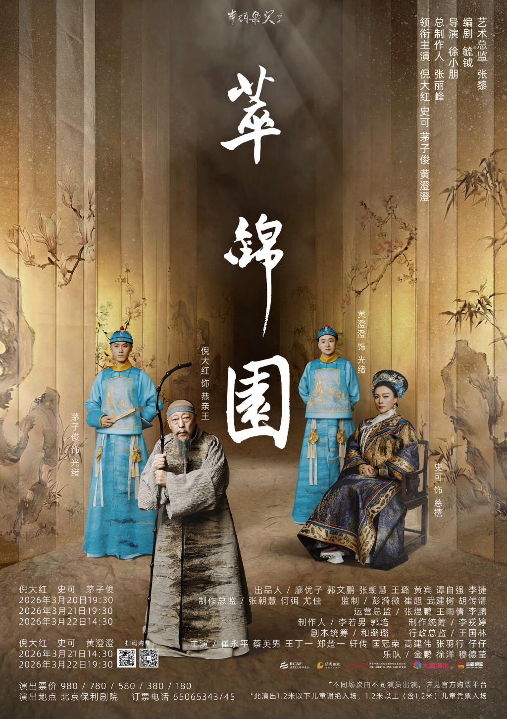 3月20日至22日,原创话剧《萃锦园》在北京保利剧院完成首轮演出。该剧以戊戌变法为历史背景,将叙事空间聚焦于恭王府的园林“萃锦园”,通过艺术总监张黎、编剧毓钺、导演徐小朋及总制作人张丽峰等主创的合力,以及倪大红、史可、茅子俊、黄澄澄等演员的联袂演绎,呈现了晚清变局中的权力博弈与人性抉择,让百年前的历史对话照进当代。