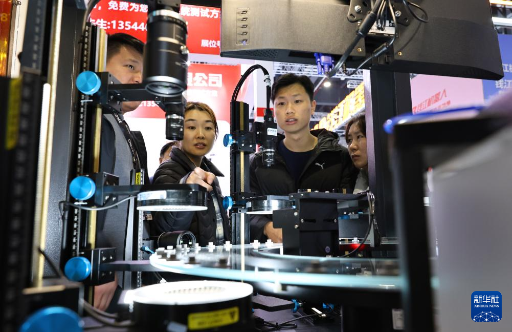 3月23日,参观者在一台光学影像自动化检测设备前驻足观看。