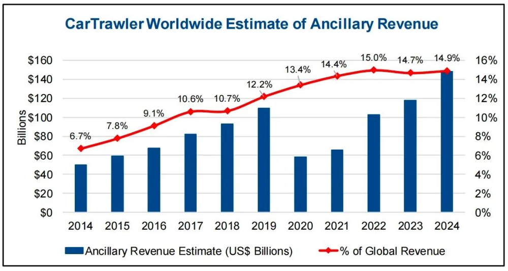 以2024年为例,报告显示,全球航空公司辅营收入将飙升至1484亿美元,贡献了14.9%的收入,廉航公司更是遥遥领先,最高达到56.4%。