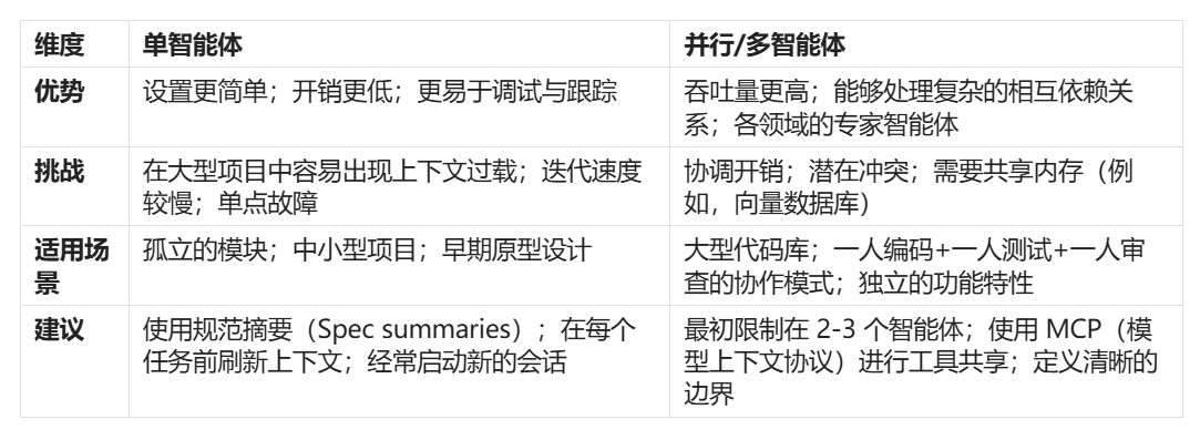 谨慎并行化:有些开发者会在不同任务上并行运行多个 Agent 实例(如前文提到的子 Agent)。这可以加速开发——比方说,一个 Agent 生成代码的同时,另一个编写测试;或者同时构建两个功能。如果你走这条路,请确保任务是真正独立的或已明确分离,以避免冲突(规范中应注明任何依赖关系)。比方说,不要让两个 Agent 同时修改同一个文件。一种工作流是让一个 Agent 生成代码,另一个并行评审;或者构建随后合并的独立组件。这是进阶用法,管理起来可能很费脑子(正如 Willison 所承认的,运行多个 Agent 效果惊人,但心智负担也重!)。初期建议最多运行 2-3 个 Agent,以保持可控。