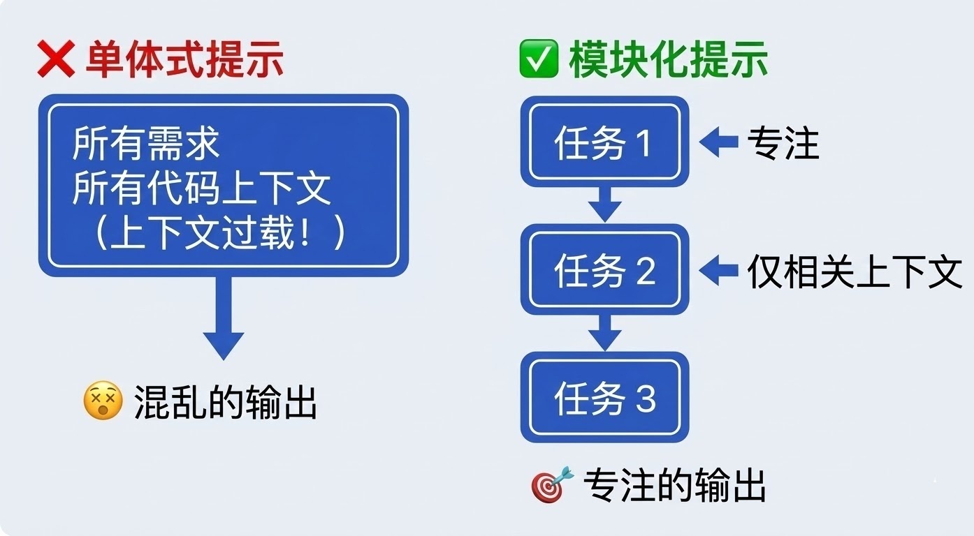 分而治之:每次给 AI 一个专注的任务,而不是一个塞满所有内容的大一统提示词。
