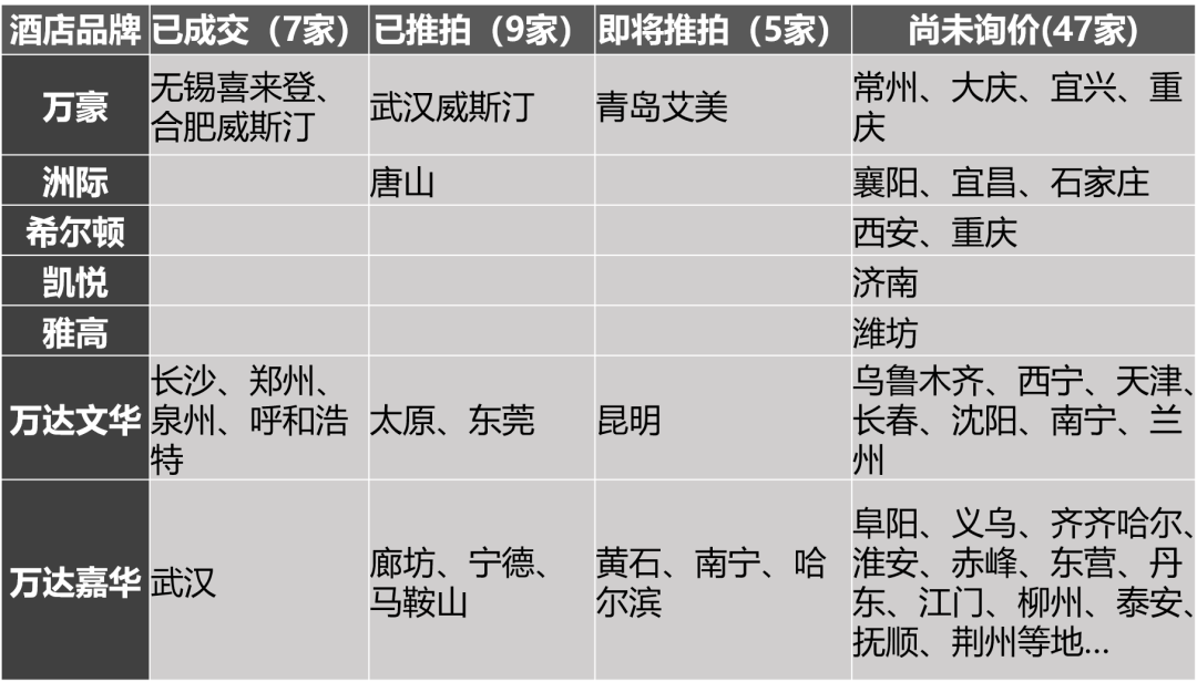 2025下半年开始,银行启动了对68家酒店的司法处置,目前已有16家酒店被上架拍卖,其中长沙文华、郑州文华、泉州文华、武汉嘉华、无锡喜来登、合肥威斯汀等7家酒店已经成交,廊坊嘉华、宁德嘉华仍在变卖阶段流拍,预计将在降价后迎来新一轮拍卖。