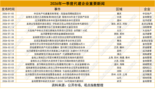 报告期内,多家代建企业相继披露2025年经营业绩,新签约代建建筑面积明显分化。其中,新城建管1月19日通过官微发布2025年经营数据,全年新签约代建规划建筑面积达1061万平方米,商业代建销售额为29.6亿元,全年交付建筑面积18万平方米;截至2025年末,公司累计管理项目超155个,累计管理商业综合体项目超70个,累计总管理建筑面积突破2600万平方米。