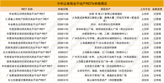 截至2026年3月,商业不动产REITs试点启动仅数月,已有15单进行申报,迎来了一波申报潮,申报积极性大幅提升。