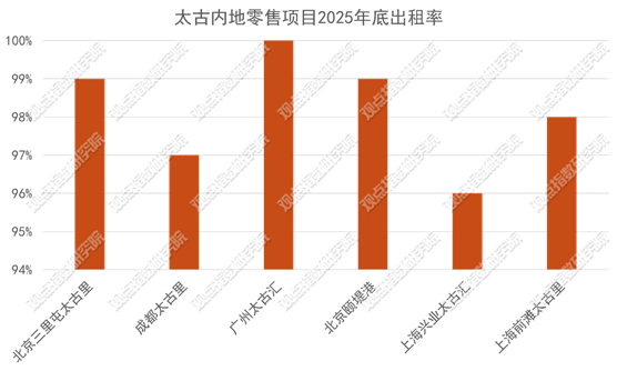 截止2025年底,太古地产内地零售项目保持高出租率,北京三里屯太古里、广州太古汇、北京颐堤港出租率分别达99%、100%、99%,上海兴业太古汇、成都太古里出租率也维持在96%以上。