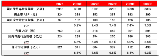 我们预计:2030年国内安全带&气囊的市场规模约为438亿元,2025-2030年CAGR约为6.4%,其中安全带规模为135亿元,气囊规模为303亿元。具体假设如下: