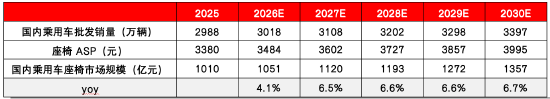 我们预计:2030年国内座椅的市场规模约为1357亿元,2025-2030年CAGR约为6.1%;具体假设如下: