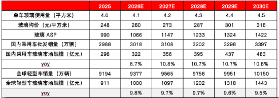2)玻璃ASP:燃油车单车玻璃使用量约为3.5-4平方米,新能源车单车使用使用量约为4.5-5.5平方米,我们假设2025年单车玻璃使用量为4平方米,2025 -2030年提升0.1平米;玻璃均价及增幅参考福耀玻璃,假设2025-2030年每年提升5%;