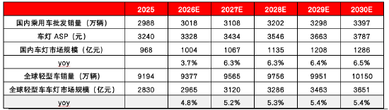 4)全球市场:2025年全球轻型车销量为9194万辆,我们预计2026-2030维持2%增速;海外新能源车渗透率偏低,车灯ASP取国内的95%。