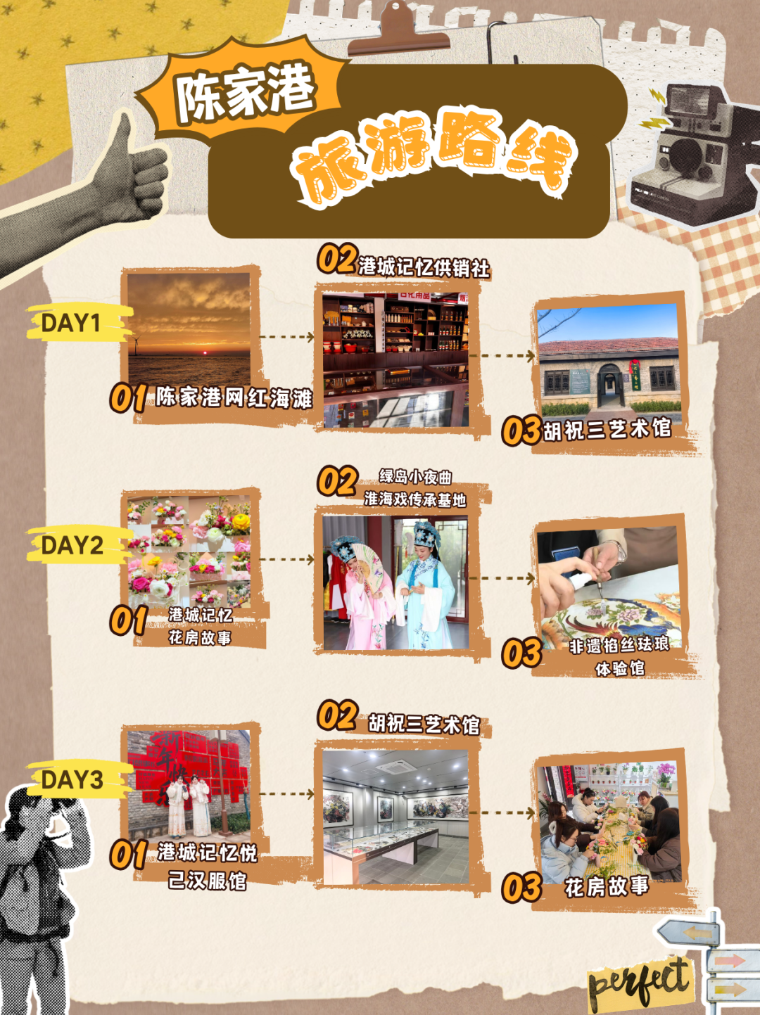 Day2:网红海滩赶海拾贝 → 海精盐厂参观 → 供销社打卡 → 花房插花