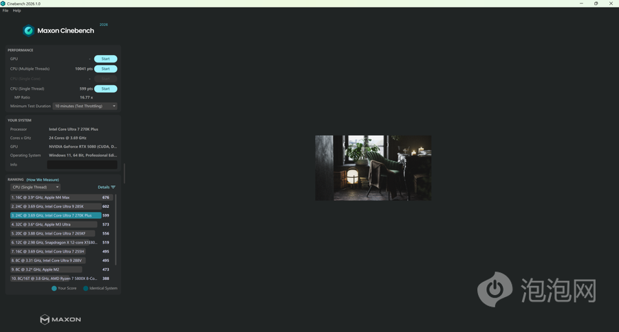 CineBench是业界通用的处理器基准测试软件,我们也使用了不同的版本进行了测试。在最新版本的Cinebench 2026当中,Ultra 7 270K Plus十分钟循环测试成绩为单核599pts,多核10041pts,多核成绩相比Ultra 7 265K提高了7.7%左右,单核成绩则是有着24%的提升。