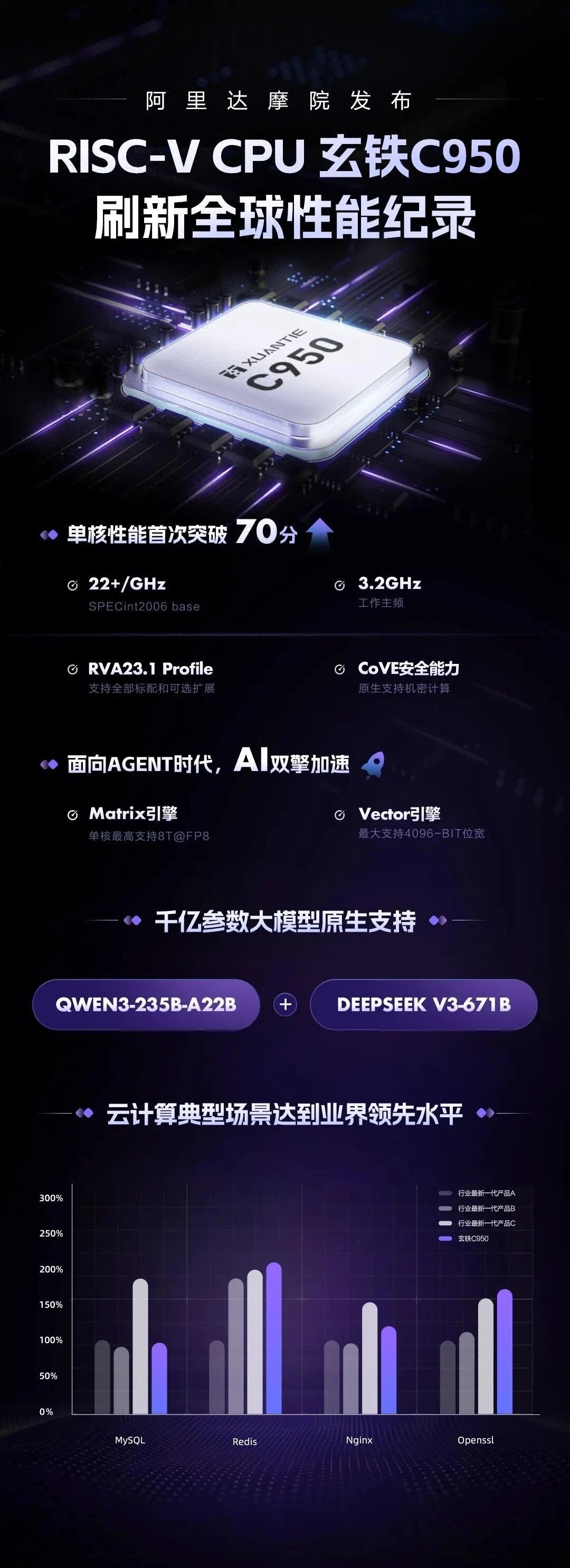 3月24日,在上海举行的2026玄铁RISC-V生态大会上,阿里巴巴达摩院发布新一代旗舰CPU产品玄铁C950。其采用开源RISC-V架构,单核通用性能在SPECint2006基准测试中突破70分,刷新全球RISC-V CPU性能纪录,适用于云计算、生成式AI、高端机器人、边缘计算等领域,性能达到业界领先水平。
