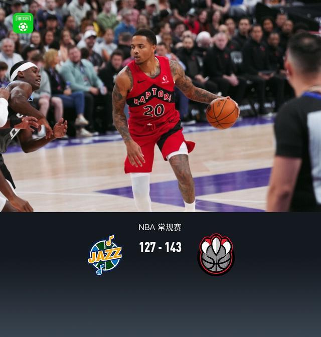 第四节爵士森萨博拿下10分,猛龙贾米森-巴特尔拿下6分,最终爵士127-143不敌猛龙