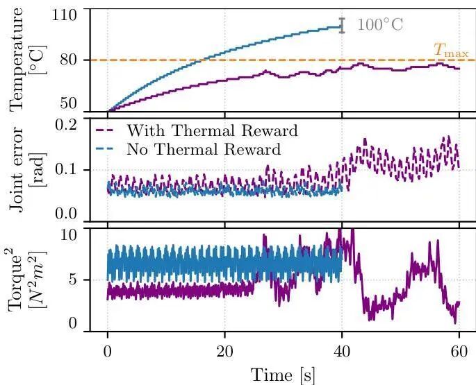 但考虑到机器人走路时容易导致电机温度过高被烧坏,并且会发出咔嚓咔嚓的机械声影响体验,工程师另外给AI设置了两套奖励机制:热感知策略(Thermal-aware Policy)和冲击减少奖励(Impact Reduction Reward)。