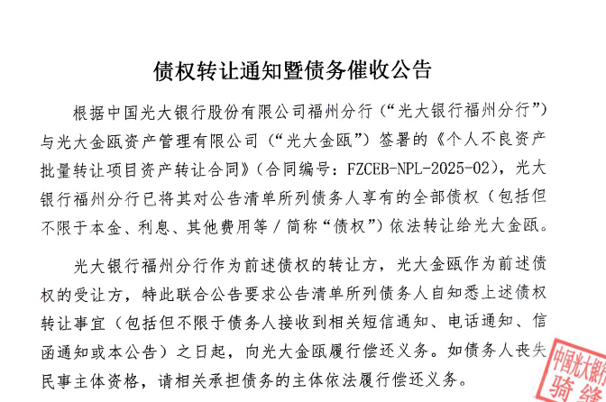 3月23日,银登中心公告显示,光大银行福州分行将一个本息合计8个亿的个人消费不良贷款债权正式转让给了光大金瓯。