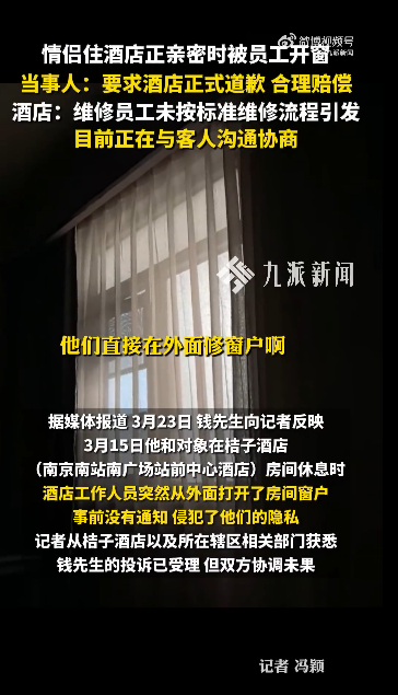 3月23日,钱先生反映3月15日他和对象在桔子酒店(南京南站南广场站前中心酒店)房间休息时,酒店工作人员突然从外面打开了房间窗户,事前没有通知,侵犯了他们的隐私。