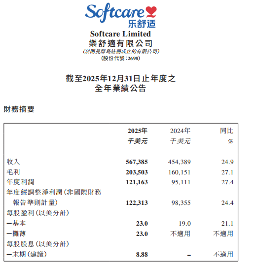 业绩方面,2025年乐舒适实现收入5.67亿美元,同比增长24.9%;毛利2.04亿美元,同比增长27.1%;年度利润1.21亿美元,同比增长27.4%;基本每股盈利23美分,同比增长21.1%。公司全年收入与利润增速较前四月增速16%与12%显著加快,增长动能持续走强。财务结构更趋稳健,流动比率由1.6升至5.7,负债比率由44.9%降至16.4%。公司拟派截至2025年12月31日止年度的末期股息每股8.88美分,合计约5500万美元,较2024年两次派息总额3535.3万美元大幅增加。