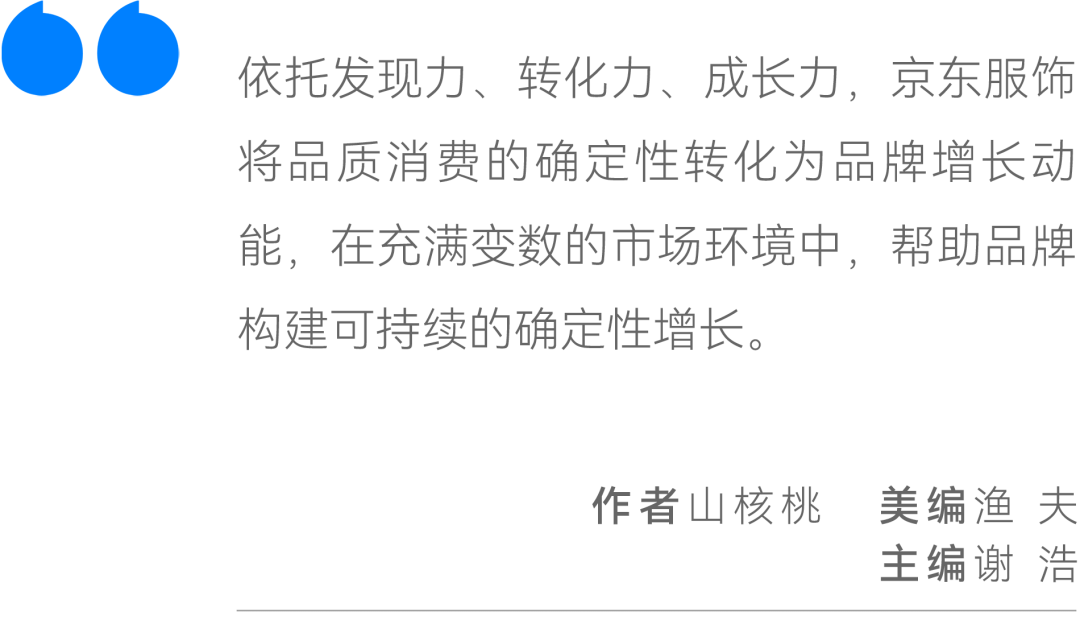 通过发现力、转化力和成长力,京东服饰正将品质的确定性,变成品牌的增长。它的价值也不止是GMV的数字增长,而是在不确定的环境中,帮助品牌建立确定性的增长能力。