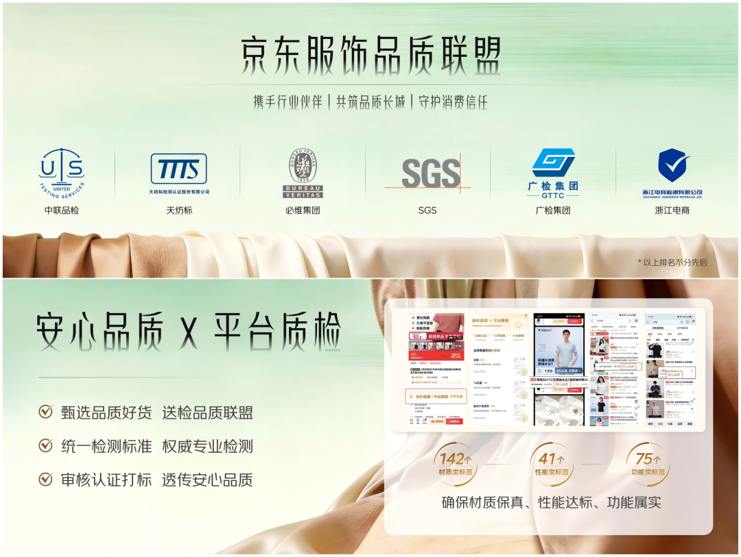 今年的时装周,京东服饰与中联品检(北京)技术集团有限公司、天纺标检测认证股份有限公司、必维国际集团、SGS、广检集团、浙江电商等多家权威第三方质检机构,携手成立了“京东服饰品质联盟”。