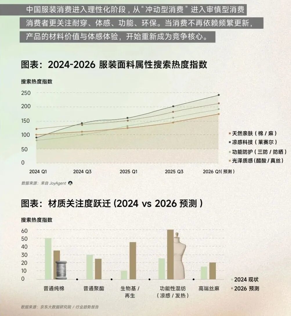 据京东服饰和VOGUE BUSINESS IN CHINA《2026 春季服装面料趋势》显示,2024年至2026年间,多类与材料属性与穿着体验相关的面料关键词搜索热度持续上升,凉感科技面料成为增长最快的面料类型之一,天然亲肤面料、功能防护面料、光泽质感面料保持稳定增长,消费者对高品质基础材料的关注稳步提升。