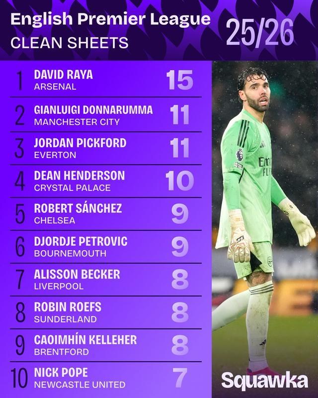 北京时间3月24日,知名数据机构Squawka统计出了本赛季至今英超零封次数最多的10名球员,戴维-拉亚15次第1,多纳鲁马和皮克福德11次并列第2,罗伯特-桑切斯和阿利松上榜。