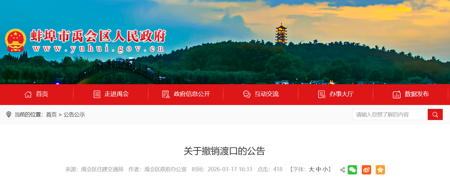 为消除渡运安全隐患,保障人民群众生命财产安全,依据《安徽省水上交通安全管理条例》、《内河渡口渡船安全管理规定》规定,决定自公告发布之日起,撤销马城渡口及新城口渡口。