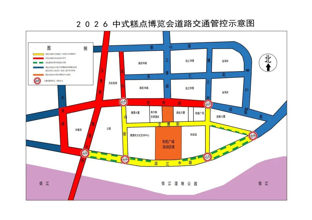 2026中式糕点博览会,将于2026年3月31日至4月2日在鹰潭市信江新区市民广场举行,为确保“中式糕点博览会”各项活动顺利进行,保障道路交通安全、有序、畅通,根据《中华人民共和国道路交通安全法实施条例》的有关规定,决定在“中式糕点博览会”期间,对信江新区市民广场周边路段实施临时交通管控措施。具体事项通告如下: