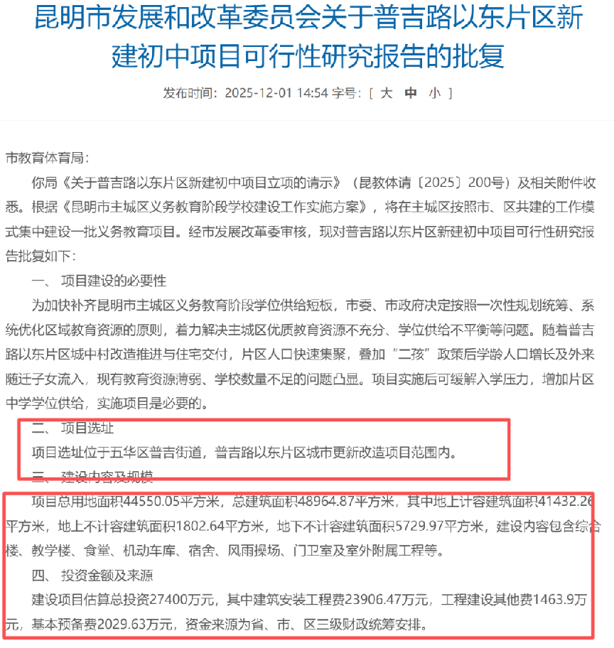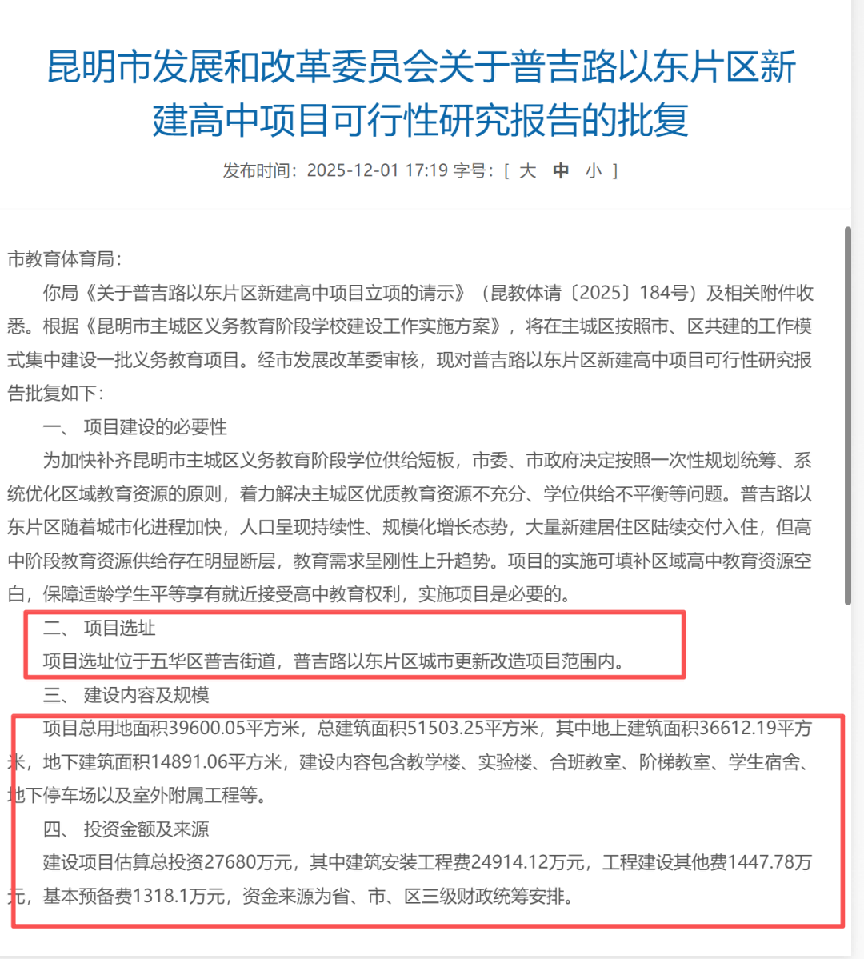 在此背景下,五华区西北新城也迎来关键进展——《普吉路以东片区新建高中项目可行性研究报告的批复》等,公布了学校项目用地的具体信息。