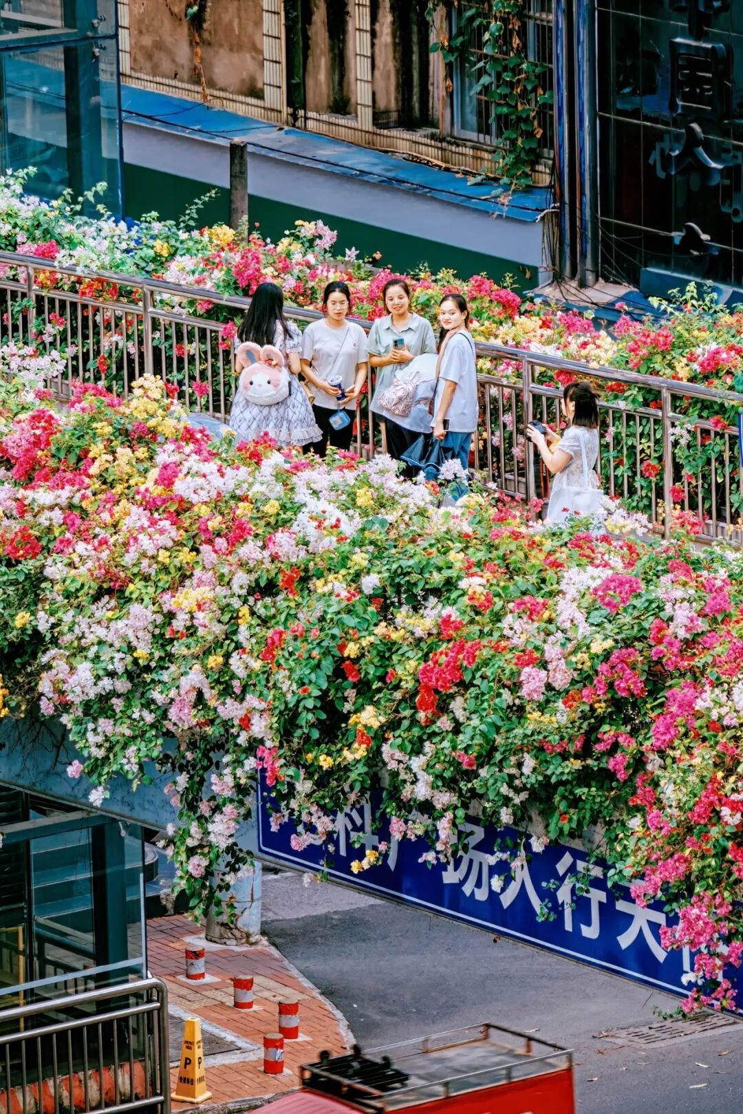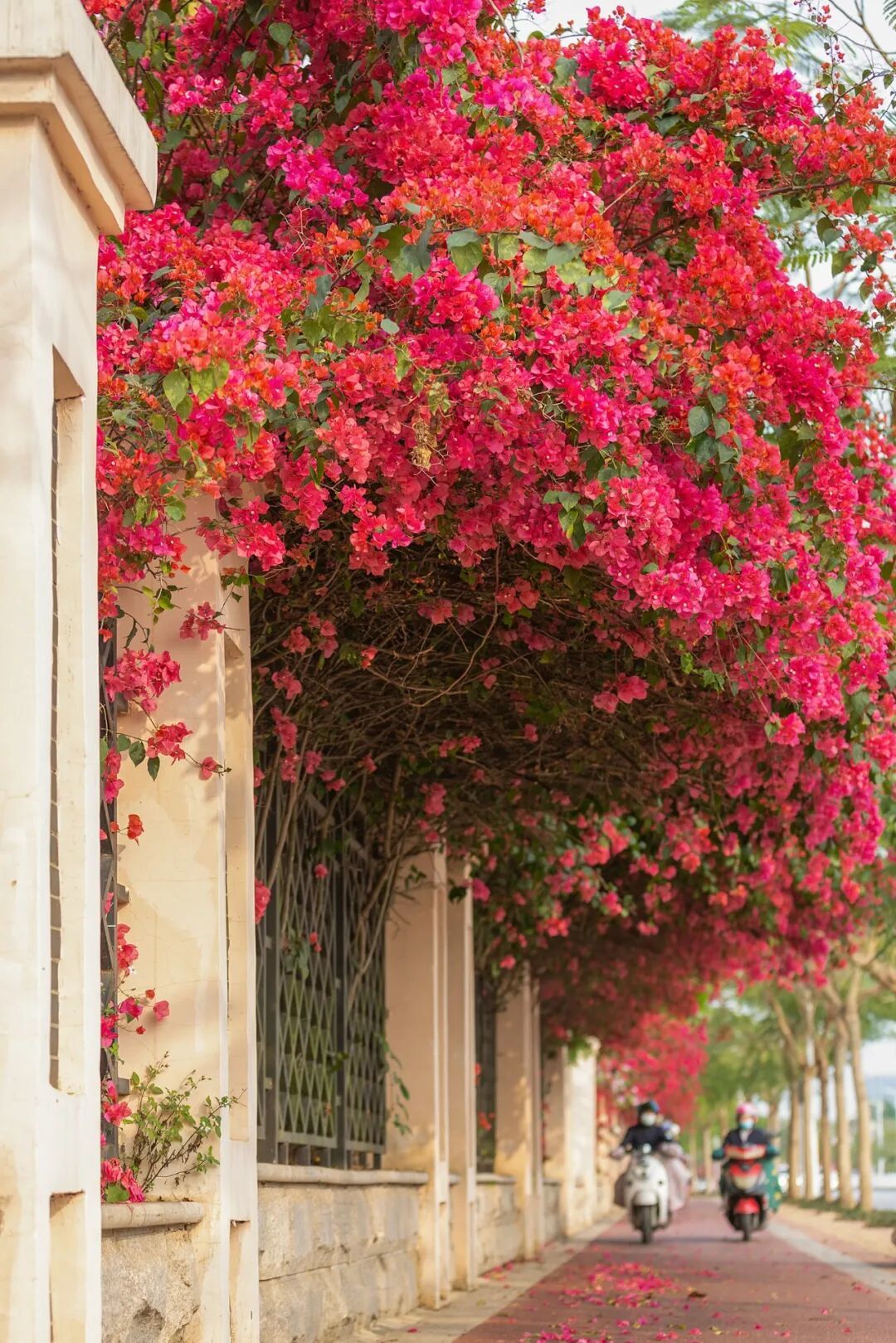 如果觉得黄花风铃过分热烈耀眼,南宁也可以给你另一种樱花、桃花与三角梅构成的粉色浪漫,3月底开始,青秀山樱花园与南宁园博园的桃花岛,粉白交织,负责温柔这座城市的棱角。而三角梅,则在3月至4月迎来爆发期,肆意地爬满了高架桥、立交桥和街头巷尾。紫红、大红、粉色的花瀑从高处倾泻而下,钢筋水泥的城市包裹在繁花之中。