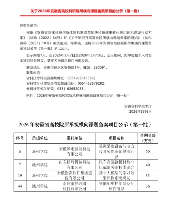 近日,安徽省科技厅正式公布2026年安徽省高校科研院所横向课题备案项目名单(第一批),池州学院4项聚焦产业技术攻关的科研课题成功获批立项。此次备案课题紧密对接电力装备、汽车制造、人工智能、智能配电等企业产业需求,通过校企合作研发,精准攻克技术难题,借助科技创新支撑地方产业进步,持续释放校地企协同创新效能。