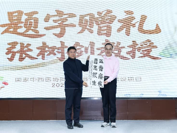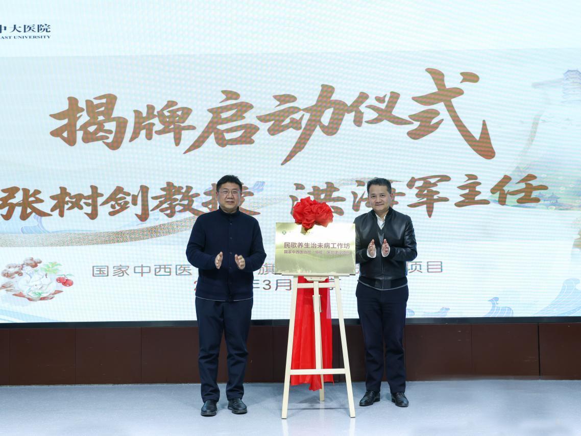 启动仪式上,中国中医科学院针灸人文研究中心主任张树剑教授、东南大学大学生艺术指导中心主任洪海军教授共同为“民歌养生治未病工作坊”揭牌,张树剑教授现场向中大医院中医医学部主任王长松赠予为工作坊亲笔题写的墨宝,为这一全国首创的健康文化项目寄予厚望、加持学术力量。