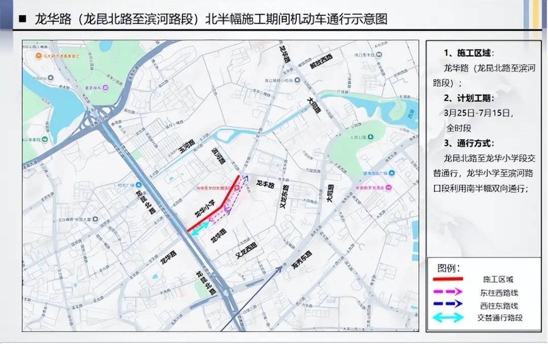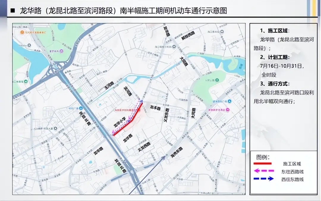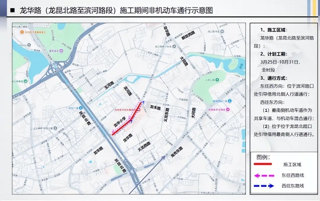 龙华路(龙昆北路至滨河路段)施工区域,实行全面交通管控,施工期间路段通行能力大幅下降,易出现长时间、大范围交通拥堵;该路段沿线分布医疗机构、学校及居民小区,出行人流车流密集,请广大市民提前做好出行规划。