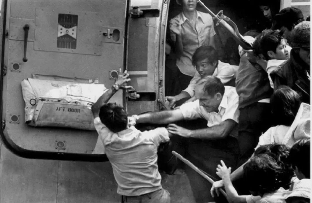 1975年4月30日,最后一批美国人乘直升机撤离西贡的美国大使馆,《波士顿环球报》拍下了经典的“西贡铁拳”一幕。