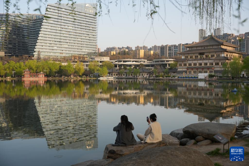 3月24日,游人在西安曲江池遗址公园赏景、拍照。