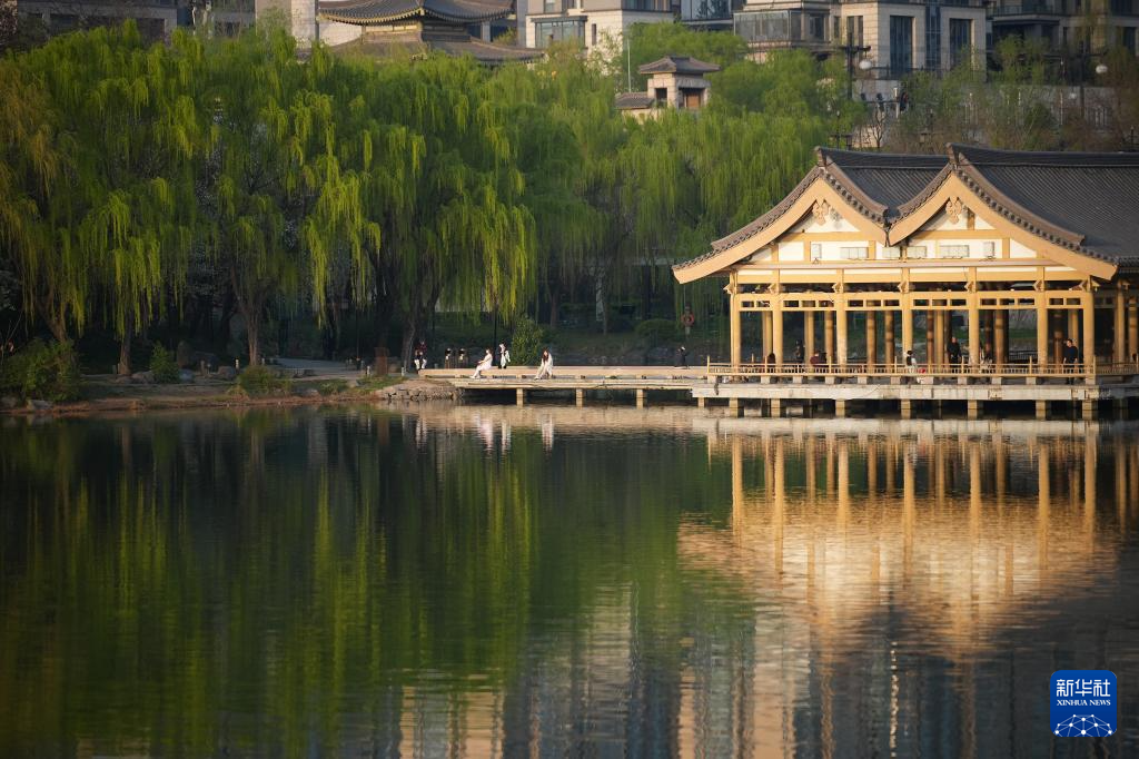 近日,古都西安曲江池畔樱花绽放、绿柳成荫,一派盎然春色吸引众多游人拍照、游玩。曲江曾经是我国历史上久负盛名的皇家园林。唐时,这里疏浚扩建出千亩水面,众多文人墨客常于此聚会并留下诗篇。