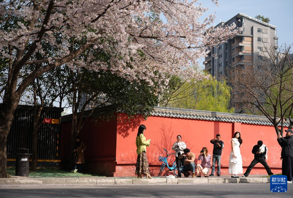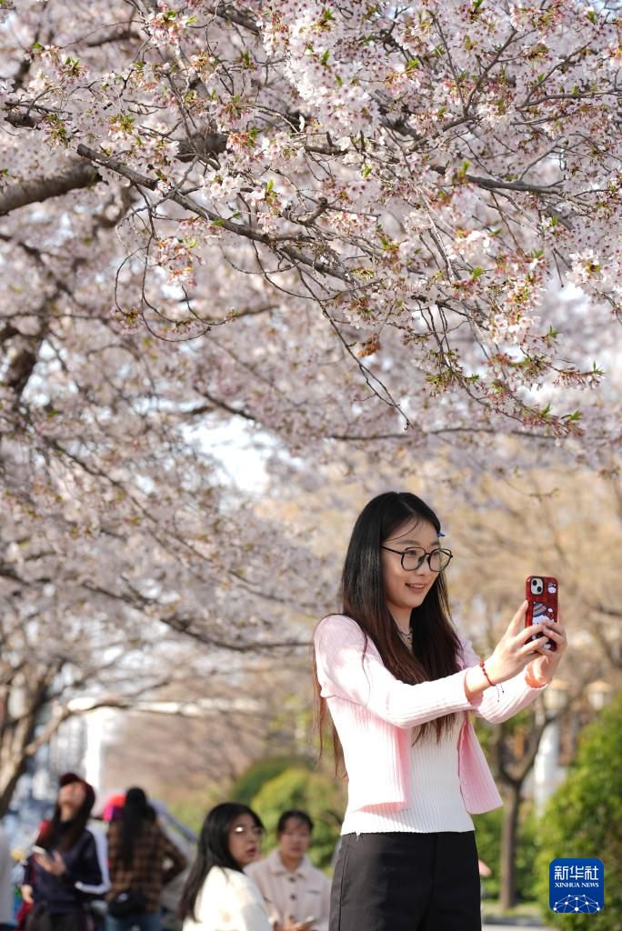3月24日,游人在西安市雁塔区曲江池西路的樱花树下拍照。