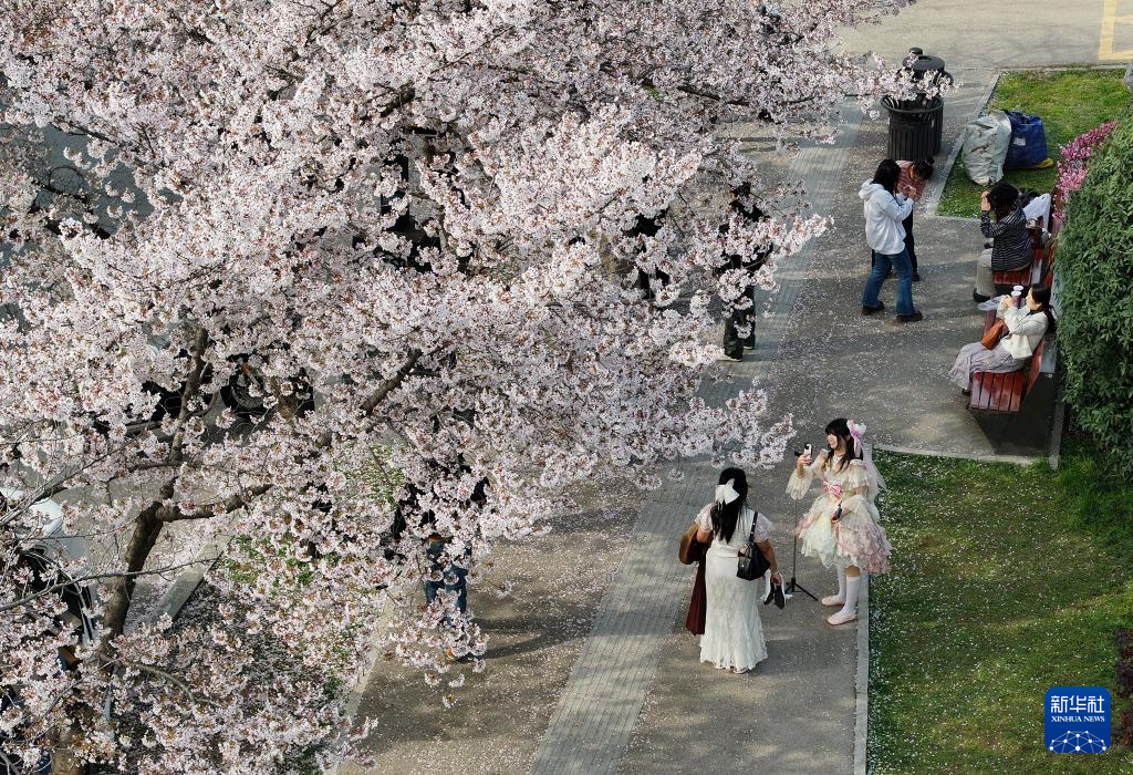 3月24日,游人在西安市雁塔区曲江池西路的樱花树下拍照、游玩(无人机照片)。