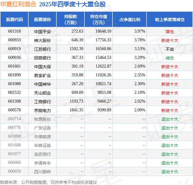 华夏红利混合的前十大重仓股如下: