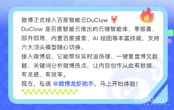 【CNMO科技消息】3月25日,百度智能云宣布,微博正式接入DuClaw。用户通过私信“@微博龙虾助手”即可获取凭证,在DuClaw中完成绑定后,便能直接在微博私信界面调用这一云端智能体,实现从数据洞察到热点追踪的全链路AI辅助内容创作。