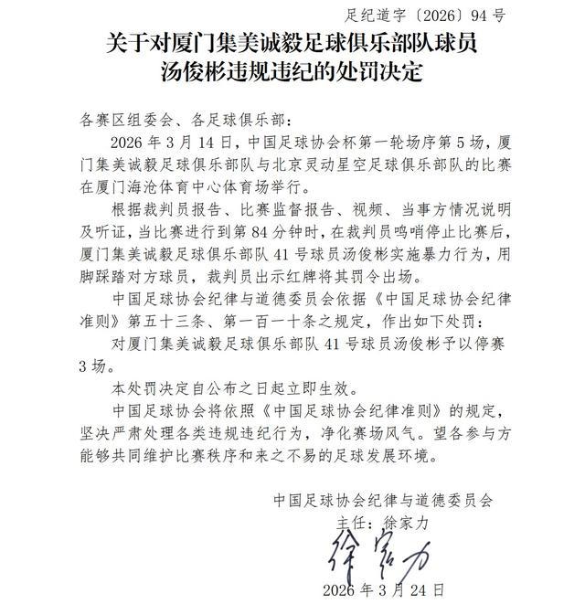 对厦门集美诚毅足球俱乐部队41号球员汤俊彬予以停赛3场。