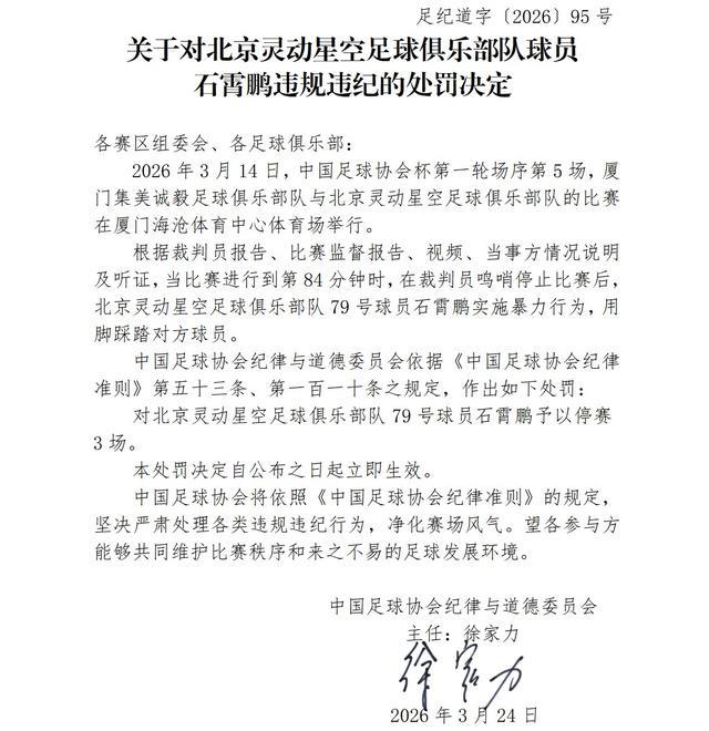 北京时间3月25日,中国足协官方发布处罚公告,北京灵动星空球员石霄鹏、厦门集美诚毅球员汤俊彬因在足协杯实施暴力行为被禁赛3场。