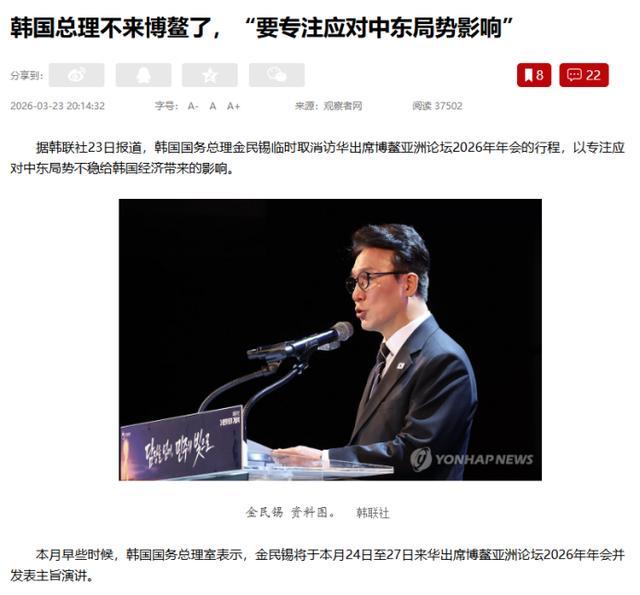 据韩联社报道,当地时间3月23日,韩国国务总理金民锡取消了出访博鳌亚洲论坛的相关行程。随后,韩国政府也针对此次取消行程给出了官方回应,韩方称中东风险局势外溢严重,被迫只能将精力投入在中东局势上,并且在最后请求中方的谅解。
