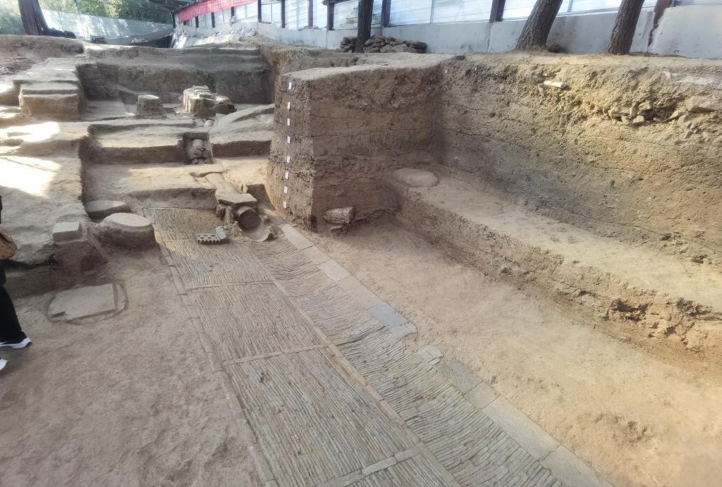 记者看到,现场还有一条南北向石铺道路,石块经过精细加工,形状规整,部分石块呈弧形凹面,整齐排列后路面一侧明显下凹。“这样它既是路,又是排水渠,一举两得。”吕凯说。