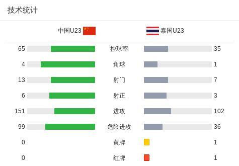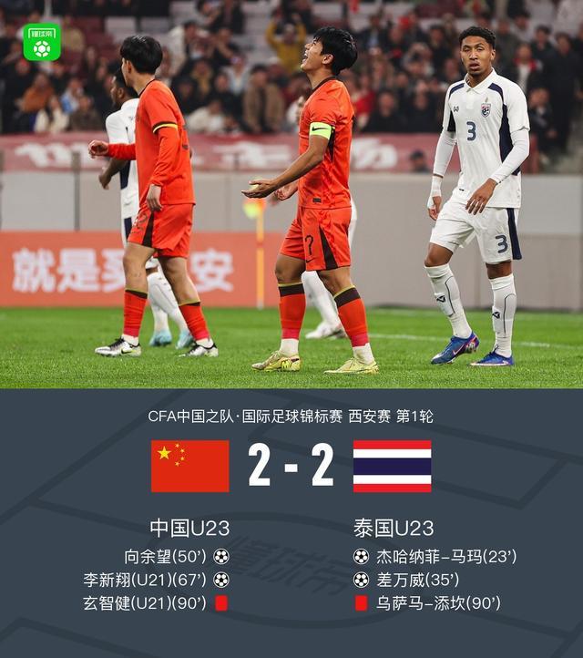 北京时间3月25日CFA中国之队·国际足球锦标赛 西安赛 第1轮,中国U23对阵泰国U23。上半场杰哈纳菲-马玛凌空抽射率先打破僵局,随后差万威利用鲍世蒙的失误破门。下半场向余望、李新翔破门帮助U23国足扳平比分,比赛最后阶段玄智健、乌萨马发生冲突,双方均被红牌罚下。最终比分中国U23 2-2 泰国U23。