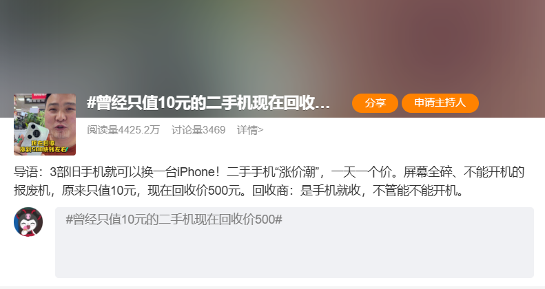 现在# 旧手机回收价暴涨五六倍#已经冲上了热搜,成了热门话题。