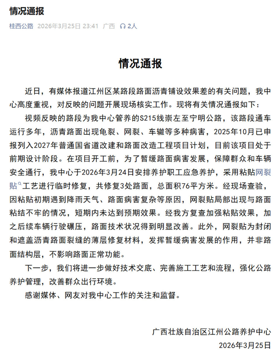 视频反映的路段为我中心管养的S215线崇左至宁明公路,该路段通车运行多年,沥青路面出现龟裂、网裂、车辙等多种病害,2025年10月已申报列入2027年普通国省道改建和路面改造工程项目计划,目前该项目处于前期设计阶段。在项目开工前,为了暂缓路面病害发展,保障群众和车辆安全通行,我中心于2026年3月24日安排养护职工应急养护,采用粘贴网裂贴工艺进行临时修复,共修复3处路面,总面积76平方米。经现场查验,因粘贴初期遇到降雨天气、路面病害复杂等原因,网裂贴局部出现与路面粘结不牢的情况,短期内未达到预期效果。经我方复查加强粘贴效果,加之后续车辆行驶碾压,路面技术状况得到明显改善。此外,网裂贴为封闭和遮盖沥青路面裂缝的薄层修复材料,发挥暂缓病害发展的作用,并非路面结构层,不影响路面正常功能。