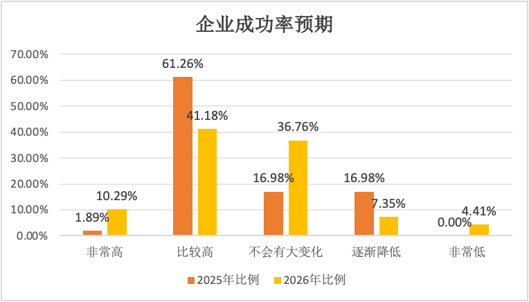 在文旅企业创业成功率方面,2026年的预期与2025年相比,乐观情绪有所回落。选择“非常高”和“比较高”的合计占比51.47%,低于2025年的63.15%。而选择“不会有大变化”的占比大幅上升至36.76%,认为成功率会“逐渐降低”和“非常低”的合计占比为11.76%。(见图9)